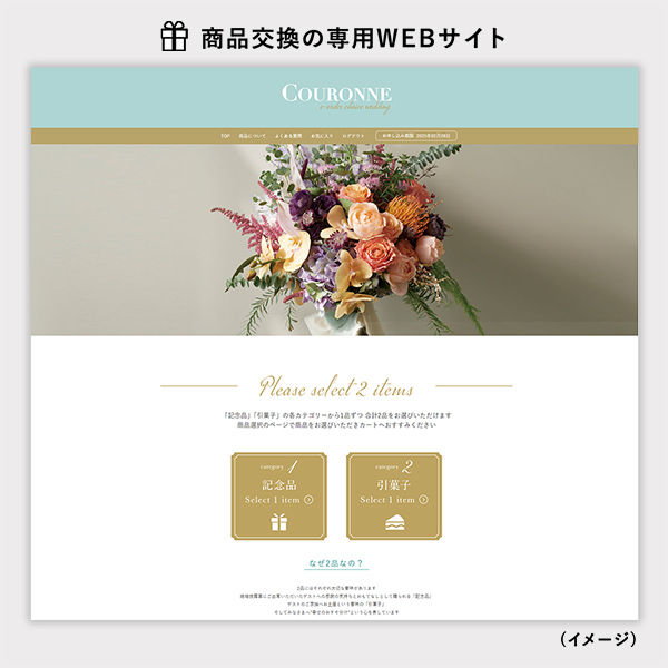 記念品、引菓子の各カテゴリーから1品ずつ、合計2品をお選びいただけます。豊富な品揃えから欲しいものがゆっくり選べてゲストの満足度もアップします。