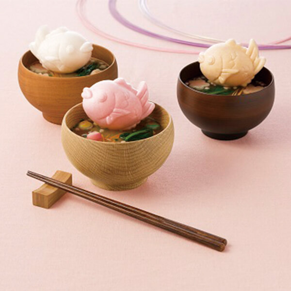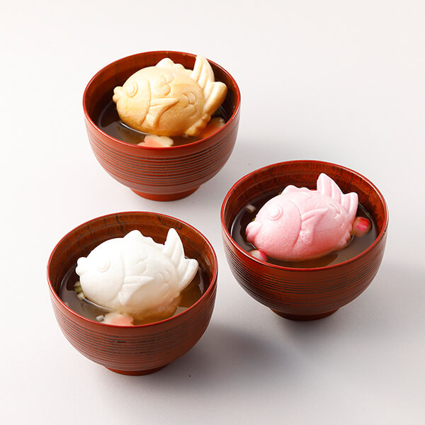 縁起のいい鯛最中に、赤みそ・白みそ・合わせみその3種の風味を詰め込んだお味噌汁です。