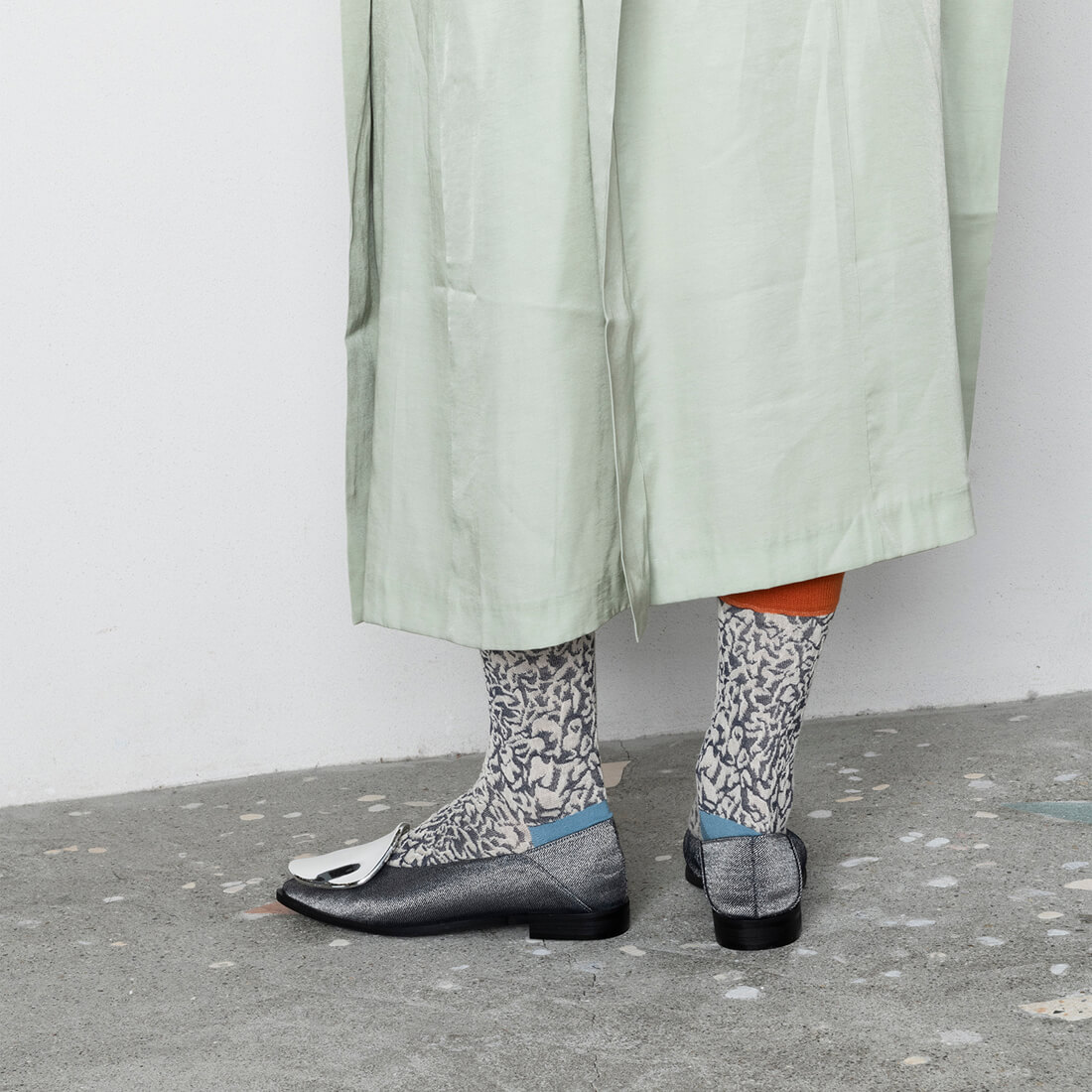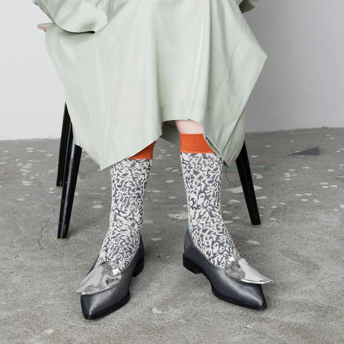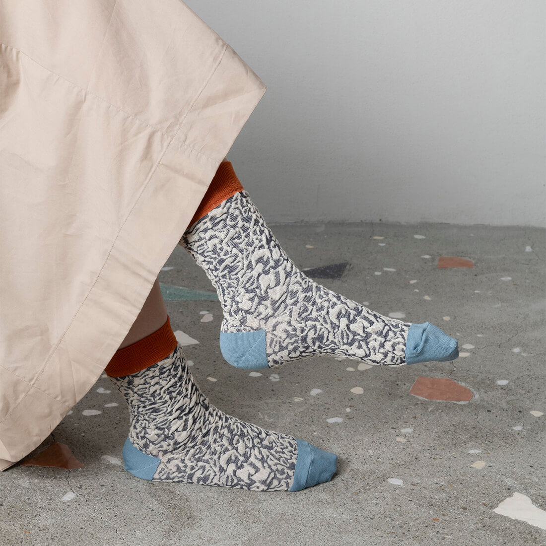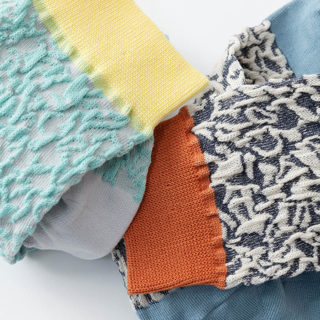 凹凸感のある生地感のテラゾ柄ソックス。シンプルな配色に履き口にポイントを入れたスタンダードなデザインです。