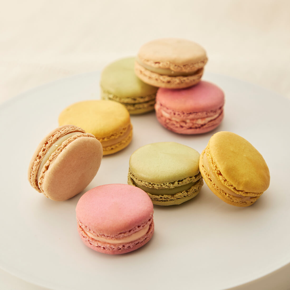 職人が一つひとつ丁寧に仕上げた自慢のマカロン。サクッとした歯ざわりの生地に、濃厚なガナッシュや贅沢な風味のクリームをサンドしました。