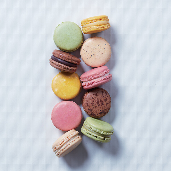 職人が一つひとつ丁寧に仕上げた自慢のマカロン。サクッとした歯ざわりの生地に、濃厚なガナッシュや贅沢な風味のクリームをサンドしました。