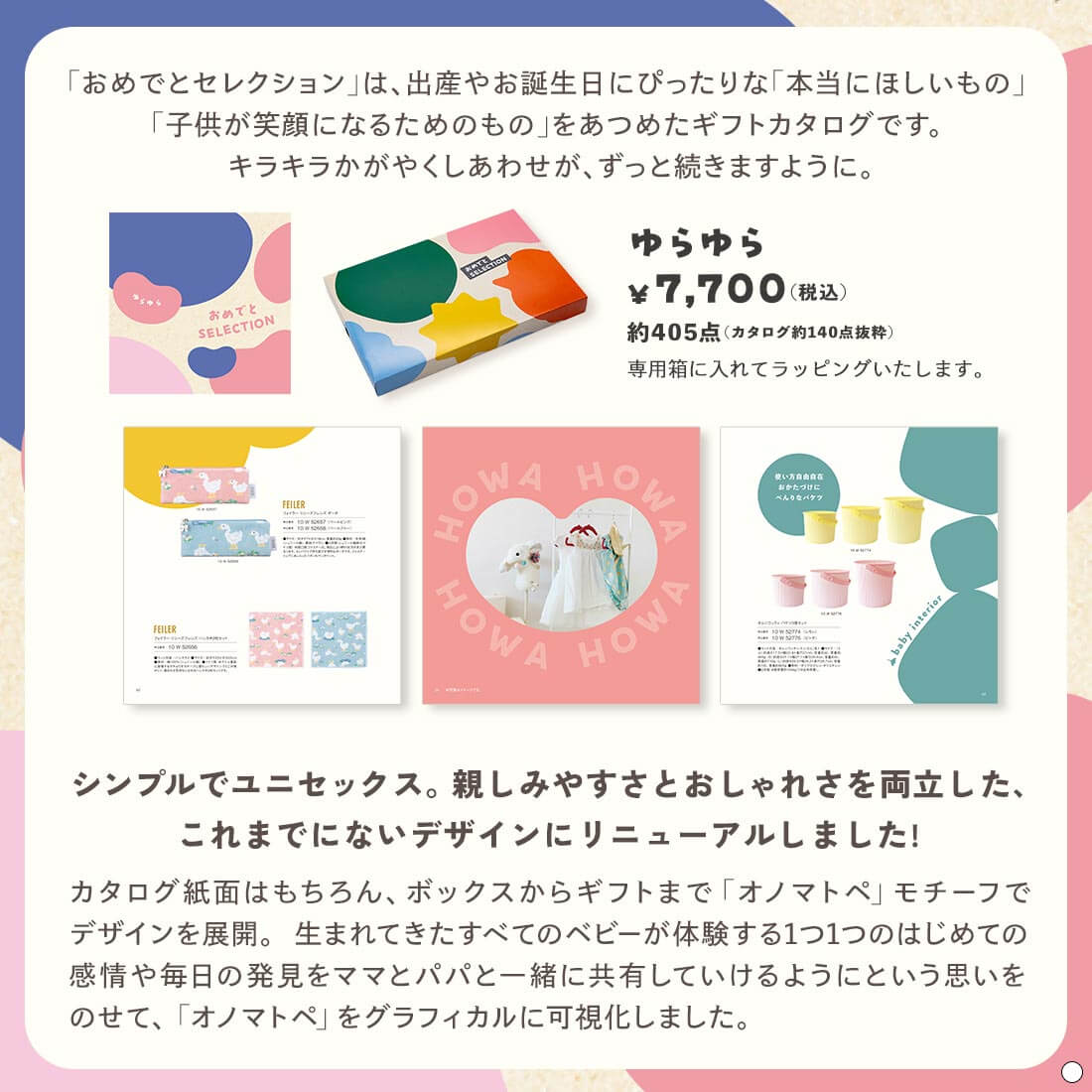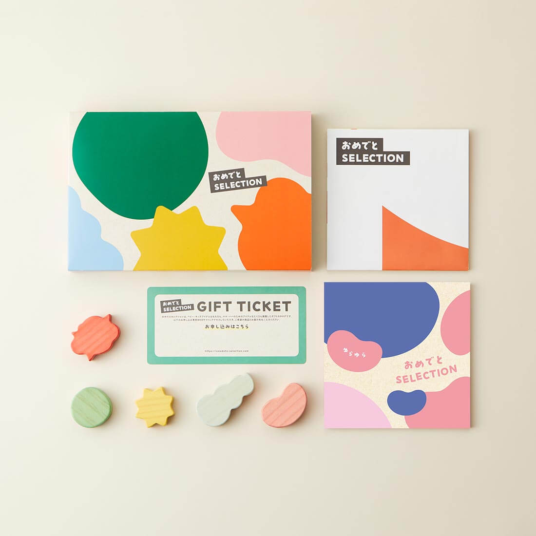 選ぶ時間がワクワクするようなPOPでかわいいギフトカタログと、ベビーとのコミュニケーションを育むオリジナルおもちゃを一緒にお贈りいただけます。