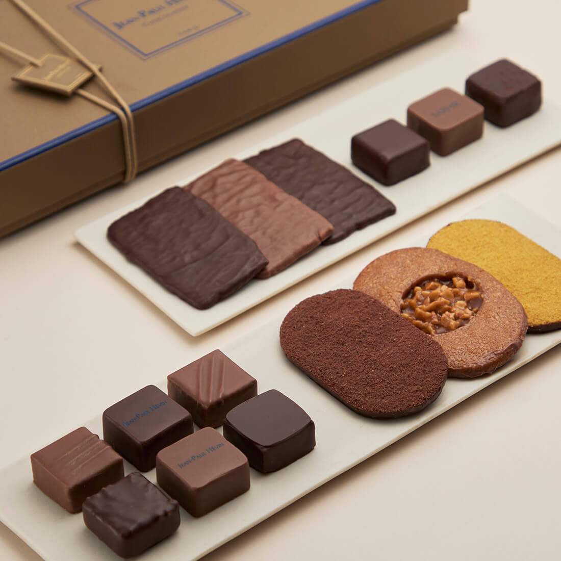 口どけなめらかなガナッシュや香ばしいナッツのプラリネなど、『ジャン=ポール・エヴァン』を代表するボンボンショコラ と、サクサクとした食感のクラッカン、軽やかな口当たりのサブレを一箱に詰合わせ。『ジャン=ポール・エヴァン』の魅力を存分にお愉しみいただけます。