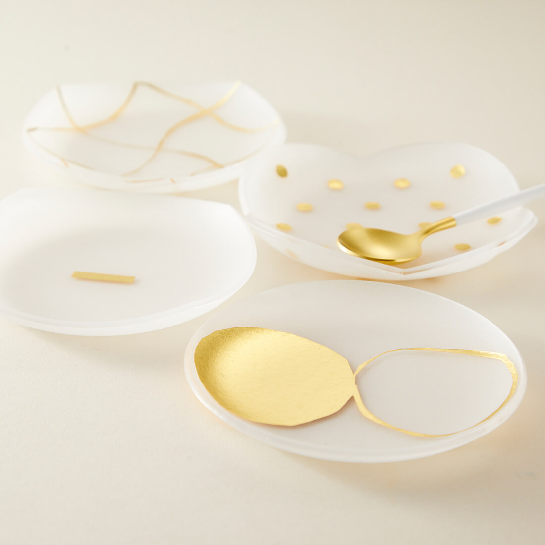 マットな質感の和紙調アクリルを使用し、表面に金色の箔押しを施した豆皿。落ち着いた素材の表面で光を反射する姿が美しく、テーブルを華やかに飾ってくれます。