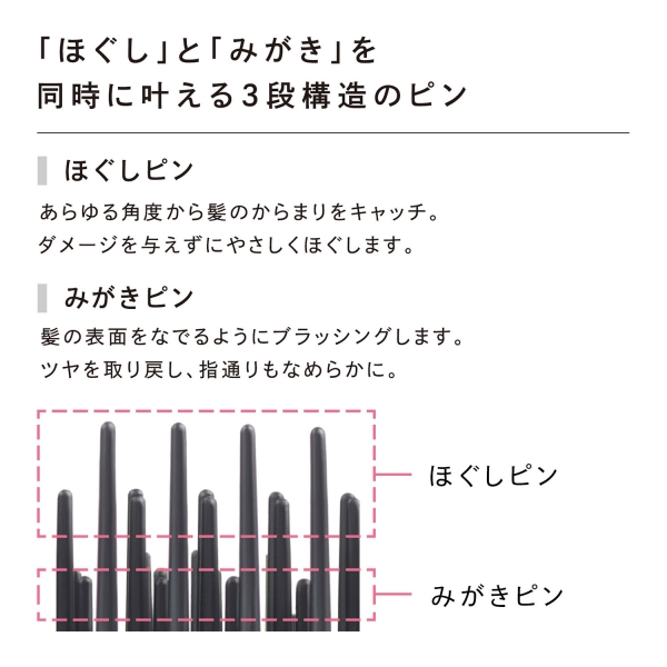・ほぐしピン:あらゆる角度から髪のからまりをキャッチ。ダメージを与えずにやさしくほぐします。