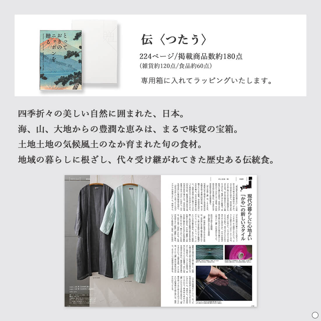 TOP > 商品カテゴリー > カタログギフト > カタログ+アイテムセット > とっておきのニッポンを贈る <伝(つたう)>+カルビー / かっぱえびせん匠海 2種詰合せ11枚・t to 5 (5種セット)