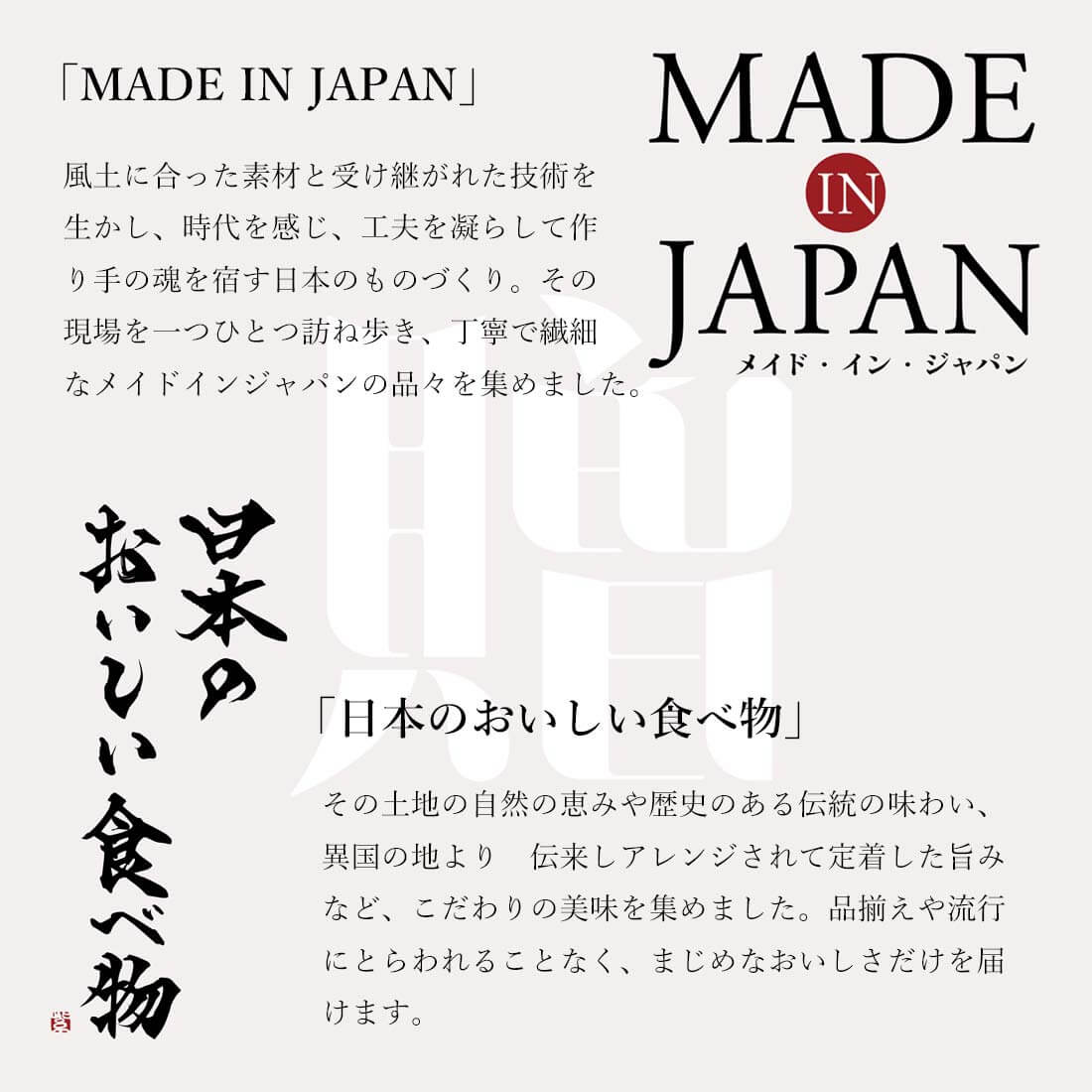| 掲載ブランド例 | カリタ / 源正宗 / 新光金属 / 雅うるし工芸 / STYLE JAPAN / アートブラシ / 諏訪田製作所 / S T A N D A R D S U P P L Y / フォルナ / sasicco / 笠盛 / 田辺真珠養殖場 / 光助 / 京都新装 / 優彩 / m i z u t o r i / ノット / ダイコープロダクト / 工房 H O S O N O / アトリエペネロープ / 竹田ブラシ / 別府つげ工芸 / 井 上 企 画 ・ 幡 / 伝統横濱スカーフ / 清原織物 / 乾レンズ / bio / カルデサック・ジャポン / S A S A W A S H I / 洛中髙岡屋 / 長尾織布 / イケヒコ・コーポレーション / ドクター・スミス / 村上パイル / 髙田耕造商店 / コサイン / S I W A | 紙和 / スワン電器 / プラチナ万年筆 / 昭和カートン / ササキ工芸 / マストロ・ジェッペット / オークヴィレッジ / ビッググロウス / BUNACO / サクラ クラフトラボ / Reela / 小倉 縞縞 / 呉竹 / ミキハウス / 華密恋 / とみおかクリーニング / 菅原工芸硝子 / 炭 谷 三 郎 商 店 / 鍋 島 虎 仙 窯 / 高橋工芸 / 栗久 / やま平窯 / 作山窯 / 萩陶苑 / K I H A R A / 梅山窯 / 吉田製陶所 / 藤総製陶所 / 山田平安堂 / 薗部産業 / 高 山 窯 / 三鈴陶器 / 元重製陶所 / 土佐龍 / k a i c o / 及源鋳造 / 肴七味 / 藤田金属 / j cocomo / 柳宗理 / ハサミポーセリン / プログレス / 能作 / アイザワ / 燕三 / テオリ / HARIO / みね屋工房 / / 紀州髙田果園 / 黒澤ファーム / 魚沼産こしひかり / 石井味噌 / 高野屋 / 十字屋 / とらふぐ / 〈金沢 / 近江町市場 ヤマカ水産〉紅ずわいがに甲羅盛り / 鹿児島県枕崎産 一本釣り鰹 / 名古屋コーチン / 土佐あかうし / 宮崎牛 / 仙台牛 / 天たつ / 田嶋ハム工房 / 塩瀬総本家 / 芳翠園 / やまつ辻田 / 秋田比内地鶏 / 鹿児島県産黒毛和牛 / 鹿児島県産黒豚 / 京園 / 日本橋 古樹軒 / 湯波吉 / オオハシ商店 / 日和屋 / NEEDS / ビストア / 鳥取県産 新甘泉 / 勝山酒造 |