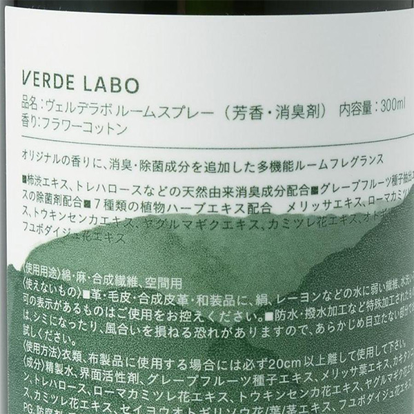 アクタスオリジナルシリーズ「VERDE LABO」。フラワーコットンは、透明感のある柔らかな石鹸の香りで、綿花のように洗いたての洗濯物を連想させる清潔感があります。ルームスプレーは、オリジナルの香りに、消臭・除菌成分を追加した多機能ルームフレグランスです。