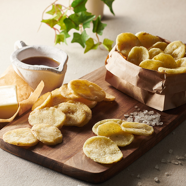 サクほろのリッチな食感とじゃがいも本来の味わいが楽しめる贈られた人がほっとする、幸せな気分になるカジュアルギフト。「メープルバター」はメープルの甘い香りに、ほんのりとバターの優しい塩味が合わさったポテトに仕上がりました。「オリーブソルト」はオリーブオイルのさわやかな香りとロレーヌ岩塩がポテトの美味しさを繊細に引き立てています。サクほろのリッチな食感とじゃがいも本来の味わいが楽しめます。
