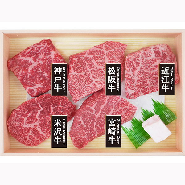 | セット内容 | 神戸牛モモ60g、松阪牛モモ60g、近江牛モモ60g、米沢牛モモ60g、宮崎牛モモ60g |