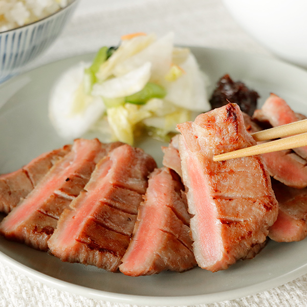 陣中の牛タンは「162時間の二段階熟成」により、塩麹を使ったタレにじっくりとつけ込んだ後に、さらに低温熟成をすることで牛タンを柔らかく仕上げ素材本来の濃厚な旨みを引き出しました。味付け、スライス、目入れ済みなので、解凍して焼くだけで仔牛ならではの柔らかくプリっとした食感をお楽しみいただけます。