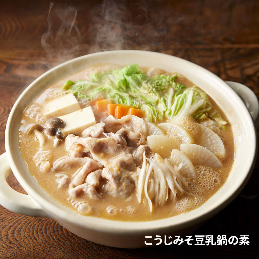 こうじみそと豆乳を合わせたコクのある鍋の素。みその甘みと豆乳の風味を生かすため、和出汁を組み合わせてシンプルに仕上げました。