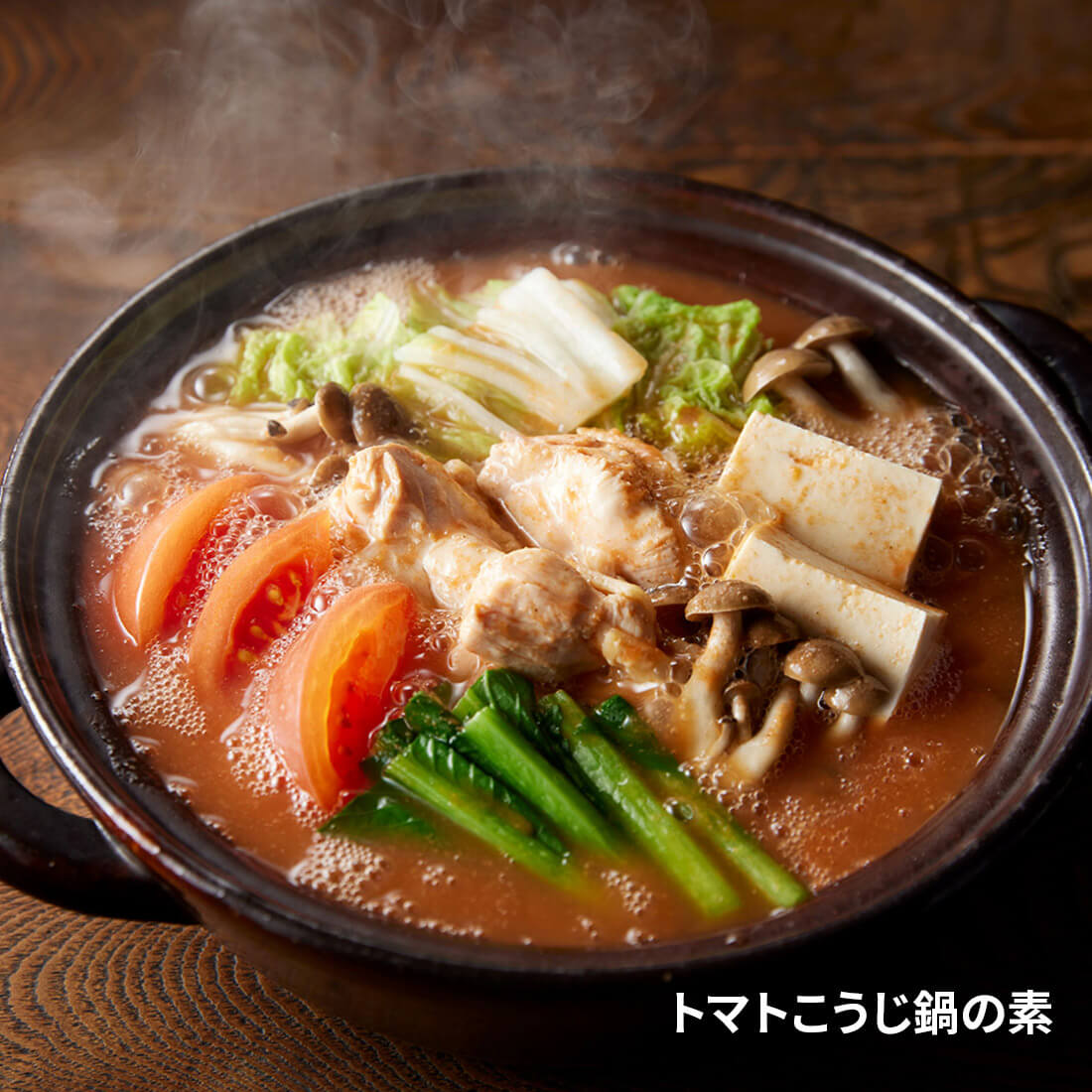 こうじみそと豆乳を合わせたまろやかな「こうじみそ豆乳鍋」、トマトこうじの旨みのきいたスープに、相性の良いハーブを加えた「トマトこうじ鍋」、数種類の赤唐辛子と合わせて、クミンや八角などをバランス良く組み合わせ、香り良く仕上げた「火鍋」と幅広い味わいをお楽しみいただけます。