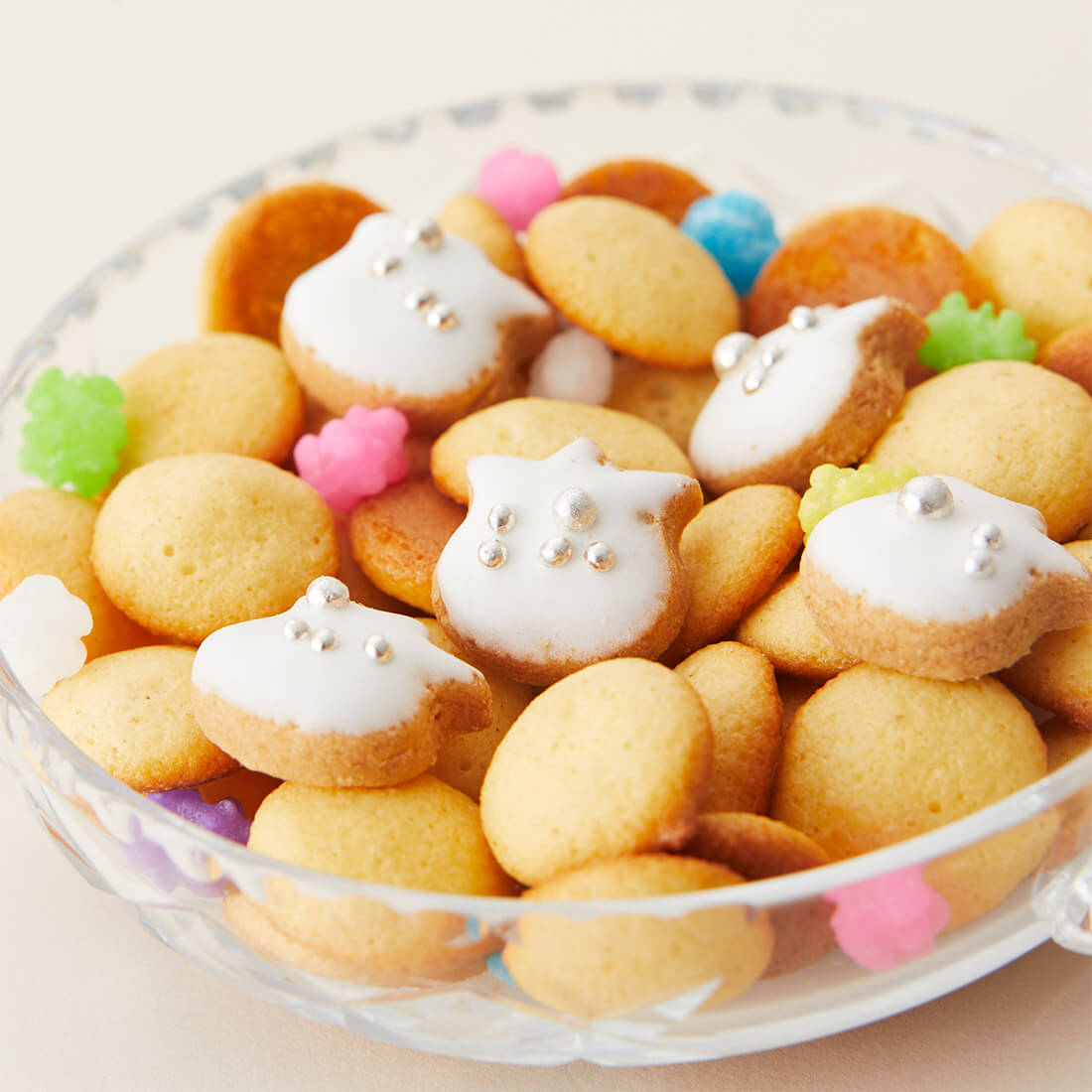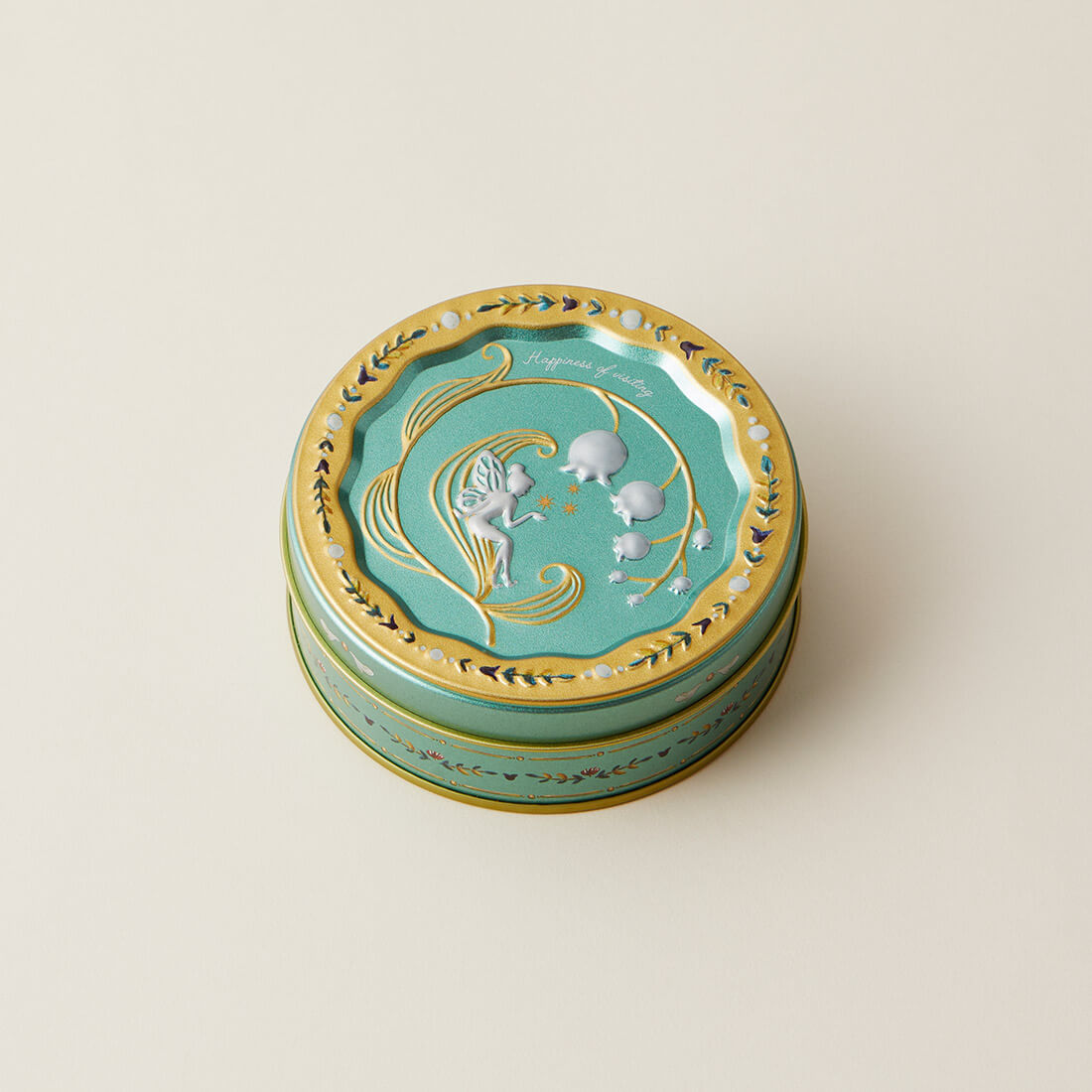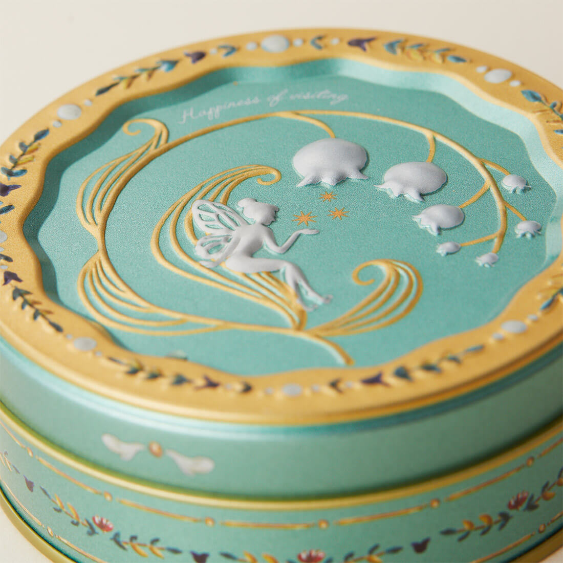 妖精が描かれた小さな缶をあけると、すずらんのアイシングクッキーや虹色の金平糖、小さなかわいいクッキーがぎっしり詰まっていて幸せな気持ちになれます。