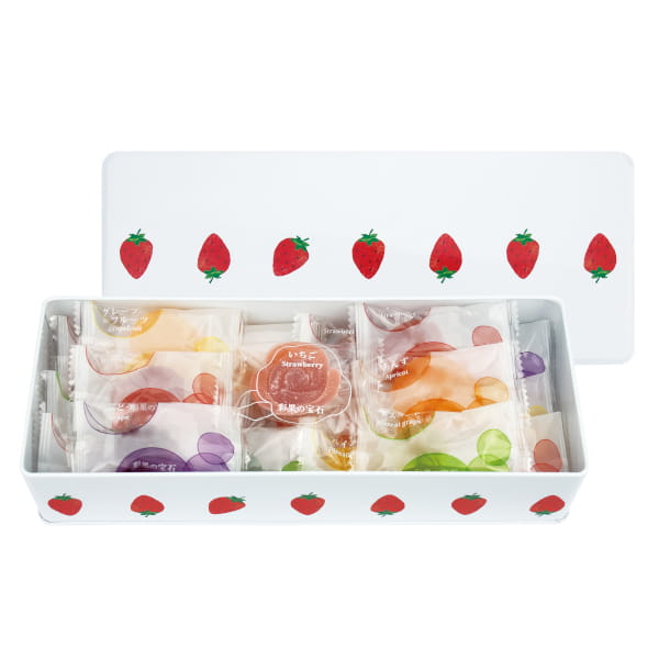 いちごのイラストを散りばめたデザイン缶に、彩り豊かなフルーツゼリーを詰合せました。
