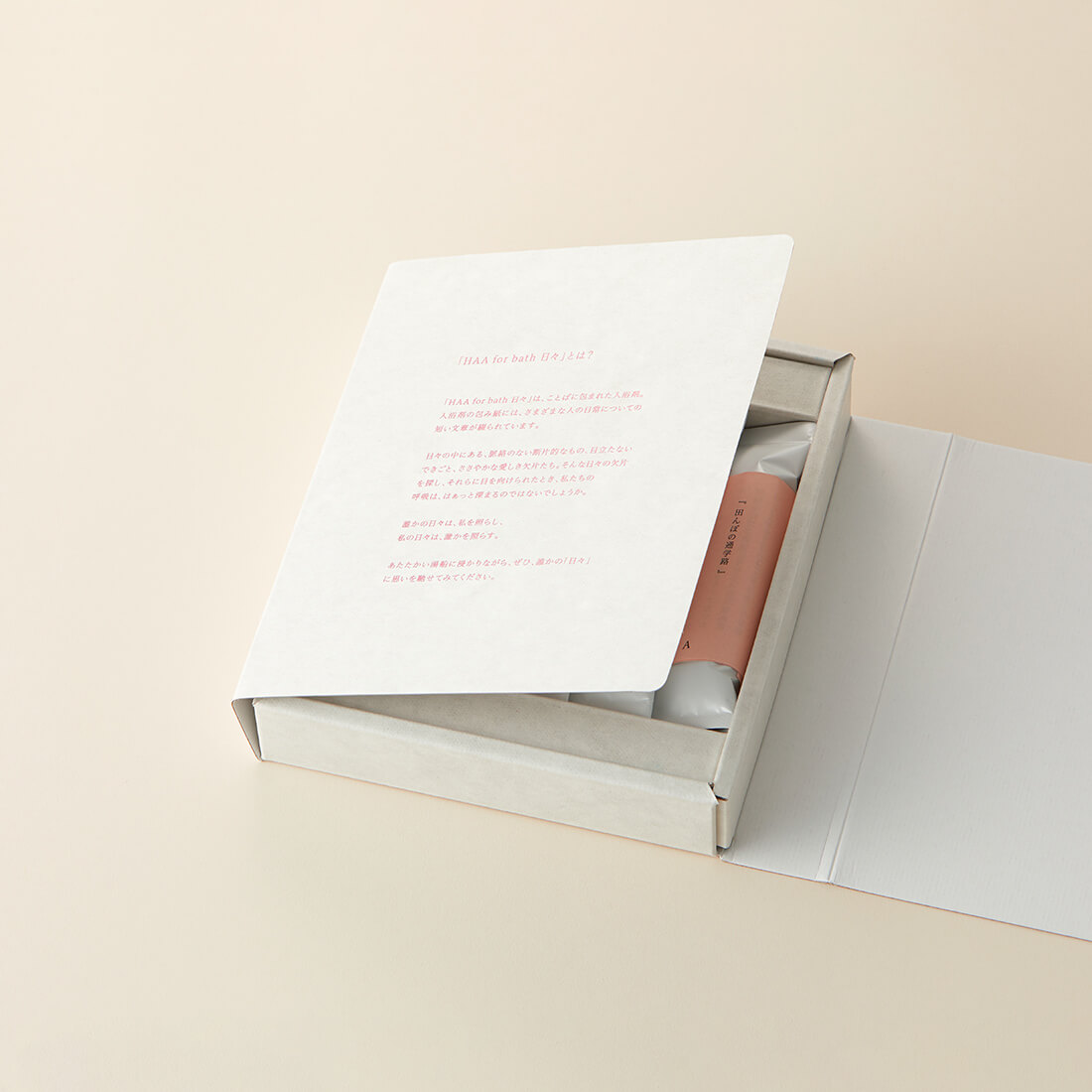 HAA(ハー)は、日本古来の養生法「湯治(とうじ)」をコンセプトにしたライフスタイルブランドです。どなたでも使いやすいように素材そのままの無香料。また、 風呂釜や浴そうを傷めてしまう原因となるイオウを含まない製法でつくられているため、ご自宅のお風呂でも気軽にお楽しみいただけます。ミネラル成分が豊富なお湯で、入浴後も身体のポカポカが続きます。包み紙の裏には、「ささやかな愛」というテーマに沿った、さまざまな方の日々が日記のように短い文章で綴られています。「ささやかな愛」は、誕生日や結婚のお祝い、何気ないプレゼントなど、日常の中にあるさまざまな愛をイメージ。包み紙は、あたたかみのある暖色を基調としています。「日々」の文字は消し銀の箔押しで、キラキラが胸の中にいつもあるイメージです。大切な人にあなたの想いを贈りませんか?