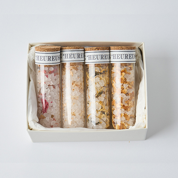 さくら、きんもくせい、ゆず、ひのき・・・日本の美しい四季を彩るバスソルトです。日本特有の4つの季節の花々たちの彩る景色が目に浮かぶようなバスタイムを演出します。まるで和歌を紡いでいくような、ゆるやかな気持ちで香りをお楽しみください。