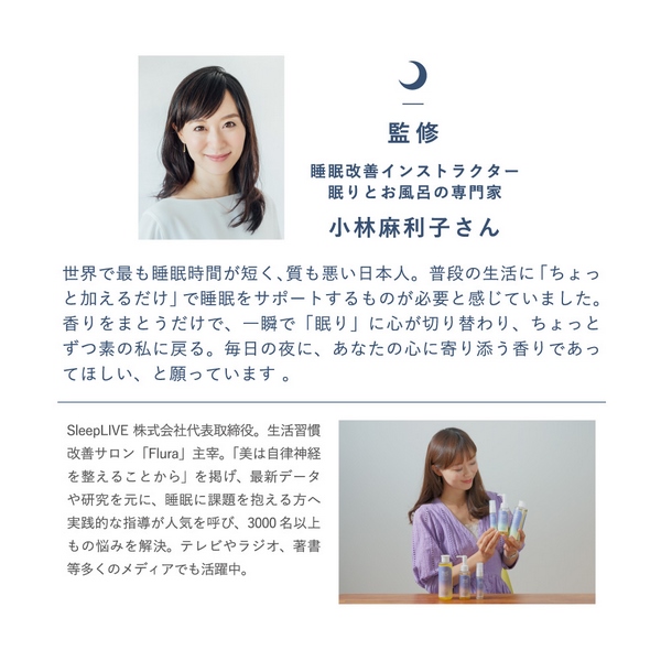 SLEEP STEPは、「睡眠に悩みを抱える多くの方へアロマで寄り添う商品作り」をコンセプトに数年かけて選び抜いたアロマアイテムです。眠りとお風呂の専門家の小林麻利子さんが監修。入浴からおやすみ前までをトータルでサポート。