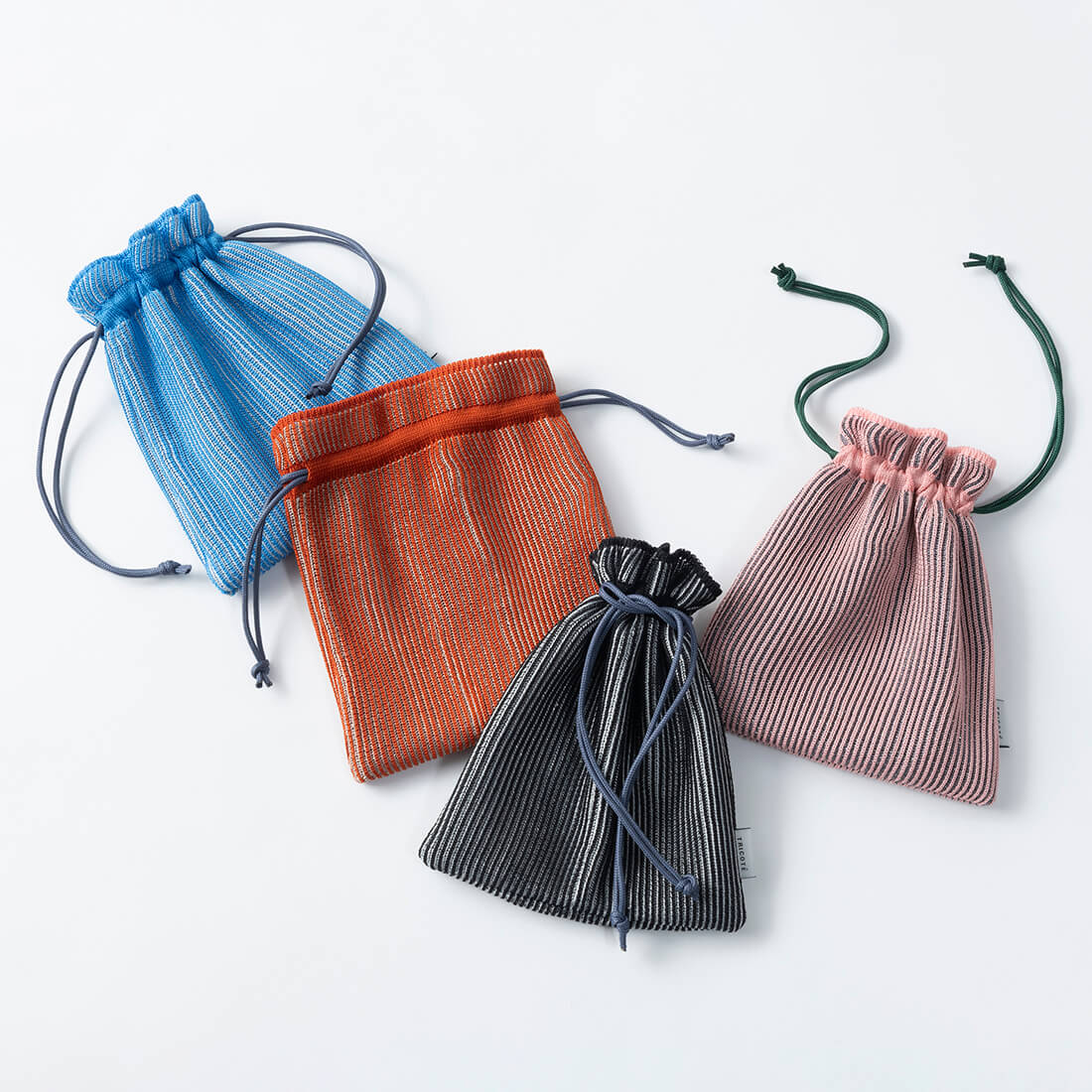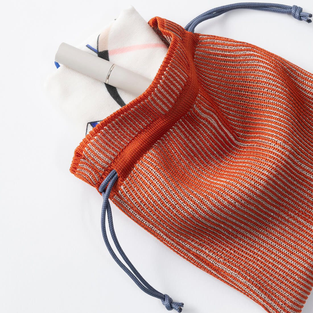 トリコテならではのニッティングの技術とデザインが印象的な巾着型ポーチ。