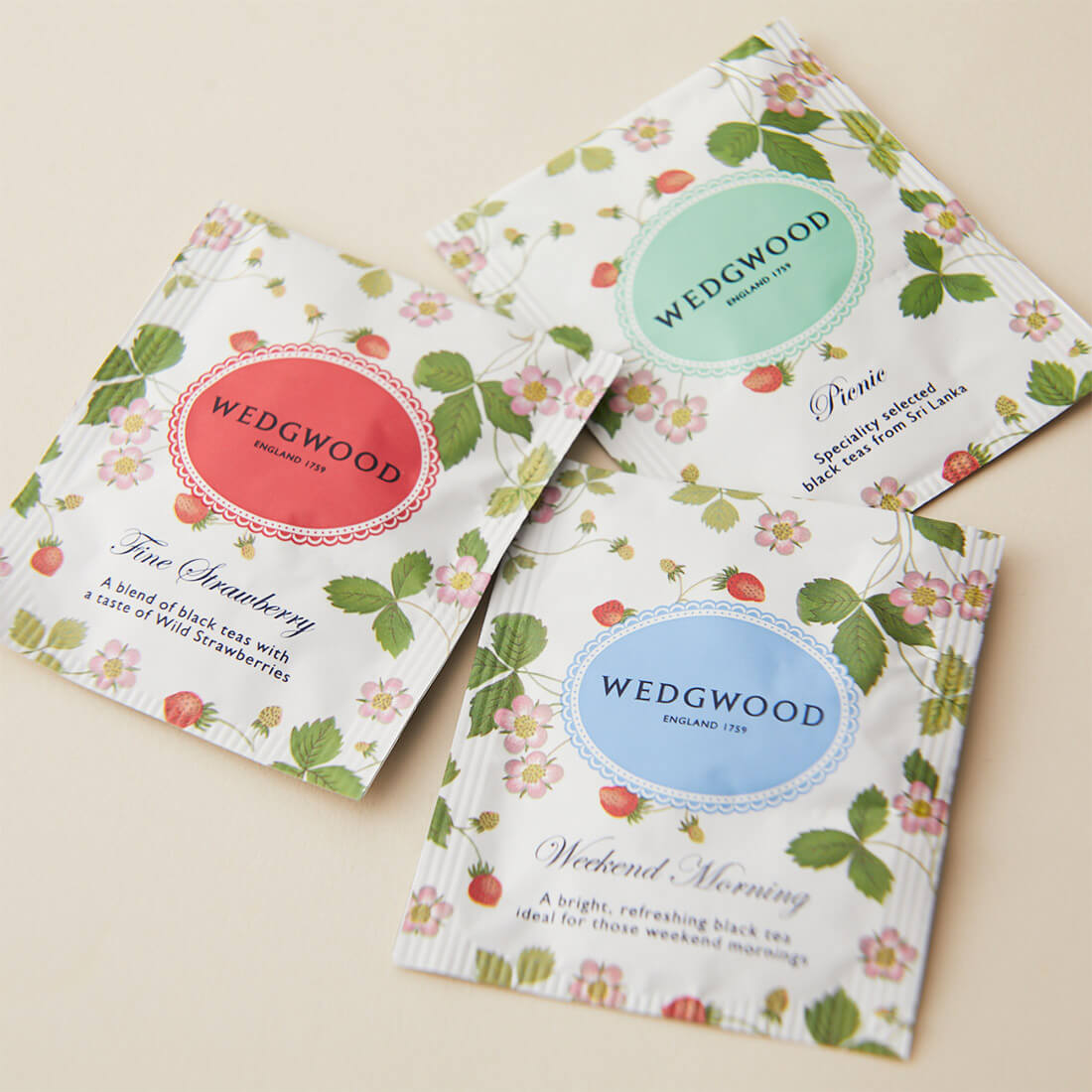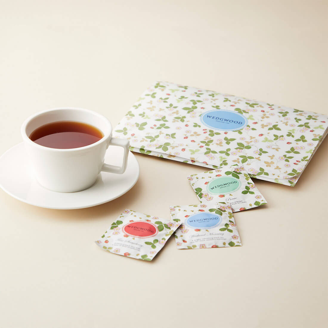 ウェッジウッドの人気柄「ワイルド ストロベリー」に包まれた3種類のアソートティーバッグ。可愛らしいプラケースのパッケージはちょっとしたお返しにぴったりです。
