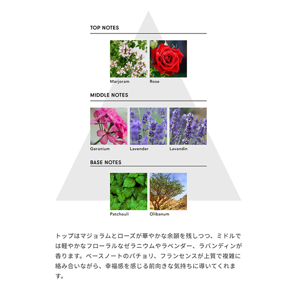 トップはマジョラムとローズが華やかな余韻を残しつつ、ミドルではゼラニウムやラベンダーなどのフローラル系が軽やかに香ります。 ベースノートのパチョリ、フランキンセンスが上質で複雑に絡み合いながら、 心の内側から幸福感を感じ、前向きな気持ちに導きます。