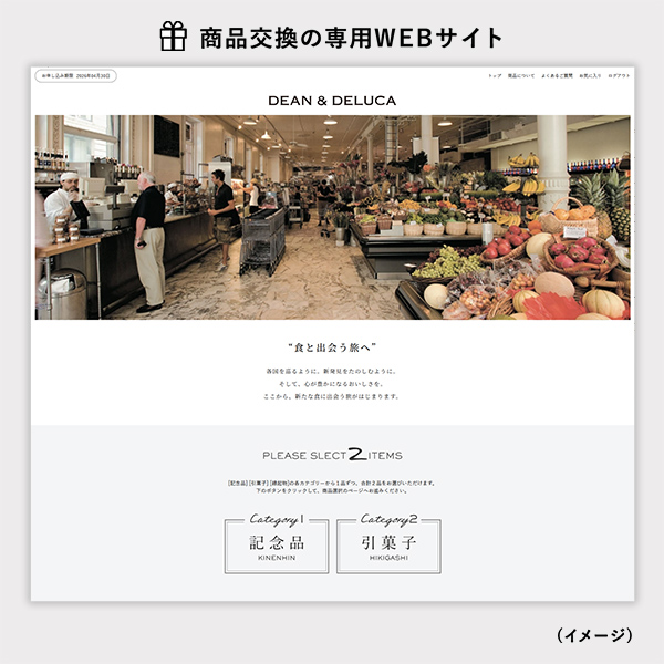 ウエディングギフト2品をゲストがお好みで選べます。 こだわりの食材やパッケージも魅力的なスイーツ、料理を楽しくするキッチン雑貨など洗練されたアイテムがいっぱい。食のセレクトショップ「DEAN & DELUCA」の魅力をそのままカタログに表現しました。