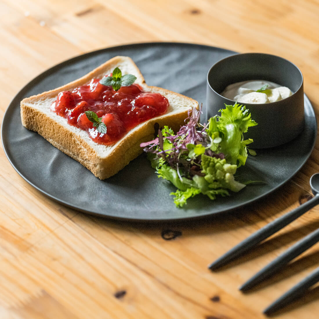 表面のニュアンシーなウェーブ模様が特徴。ソースやドレッシングがお皿全体に広がりにくく、パンケーキ・サラダなどを盛り付けるのに好適です。さらに、凹凸から水蒸気が逃げやすい「エアーソリューション構造」を採用しているためトーストとも好相性。パンの裏面が蒸れにくく、時間が経ってもカリッとした食感をキープしやすいので美味しさが引き立ちます。
