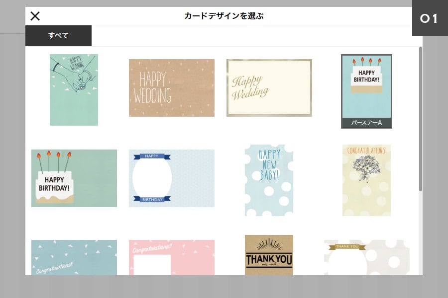「デザインを選ぶ」ボタンをクリックし、メッセージカードをご用途などに合わせてお好みのカードデザインを1つお選びクリックしてください。