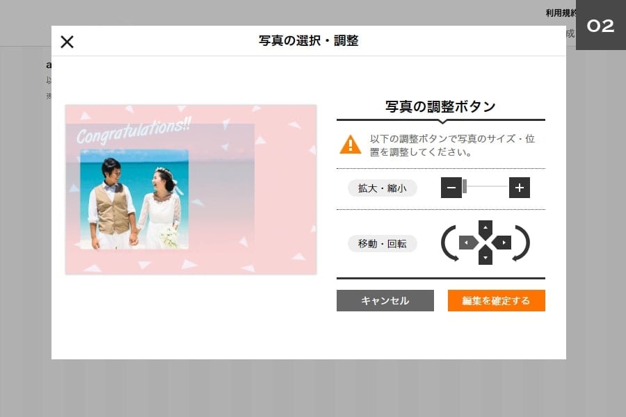 次に、「写真の位置を調整する」ボタンをクリックし、写真のサイズ・位置調整を行い完了しましたら、「編集を確定する」ボタンをクリックしてください。