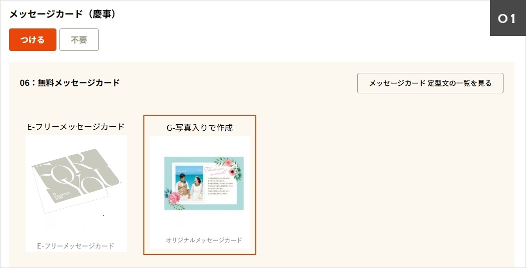 ご注文時の「商品オプション設定」にて、ご用途選択後「メッセージカード」の「オリジナルメッセージカードを使用する」を選択します。