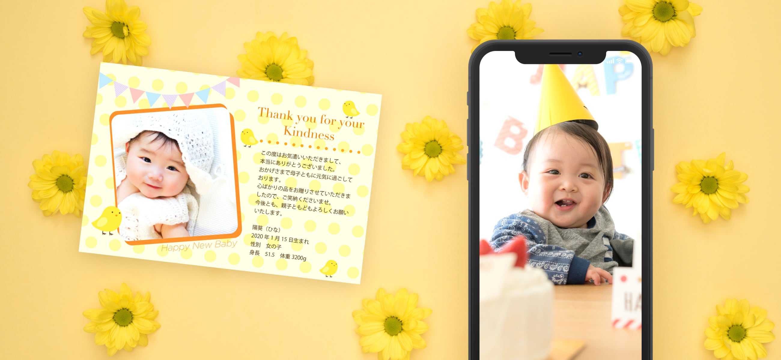 カードデザインはご用途に合わせて写真あり・写真なしのデザイン30種類以上の中から選び、写真はスマホで撮った写真をアップロードも可能!